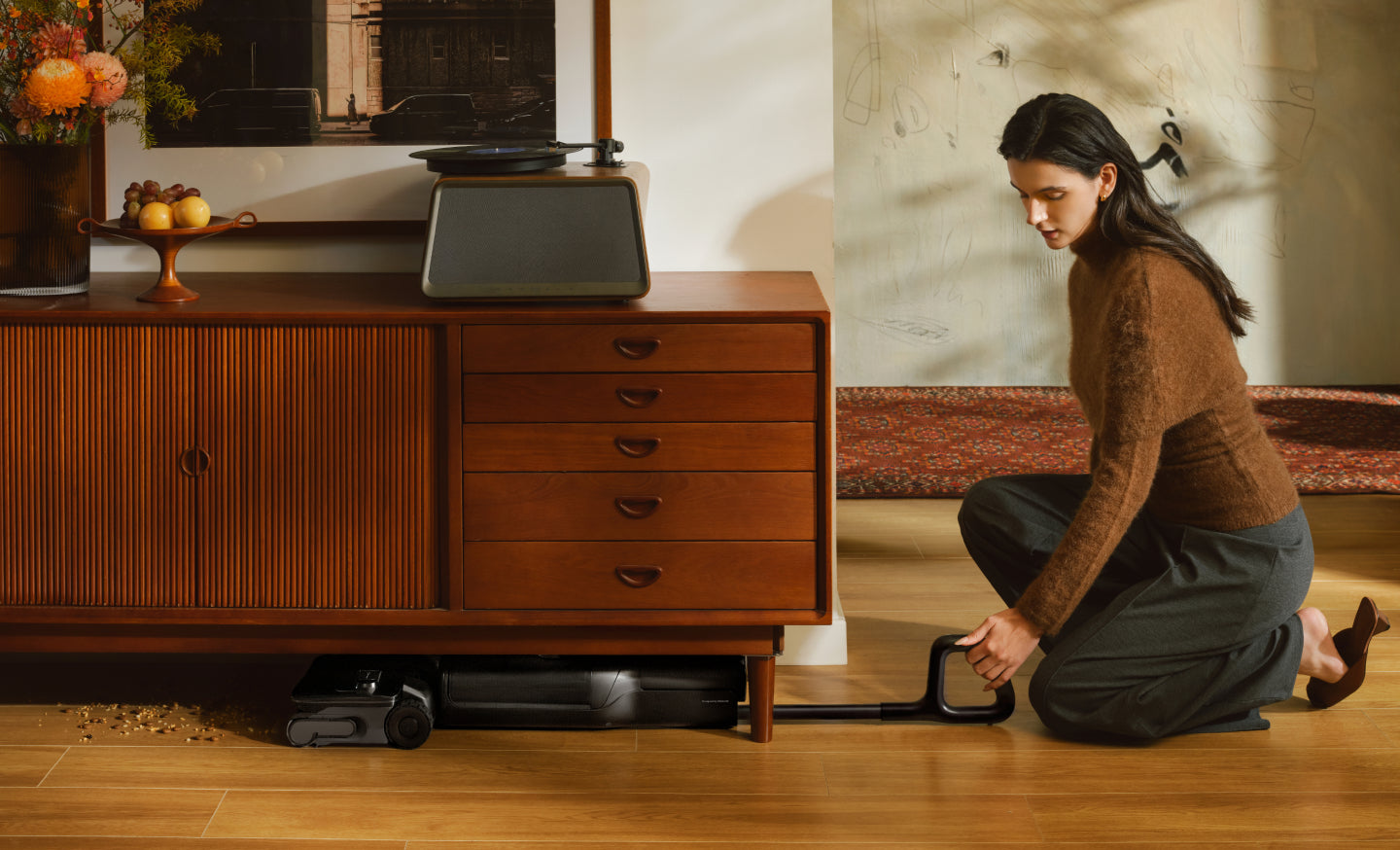 Di tempat dengan tinggi yang hanya 12,5 cm (4,9 inci)¹⁹, alat ini meluncur dengan mudah di kolong furnitur, seperti tempat tidur dan sofa.