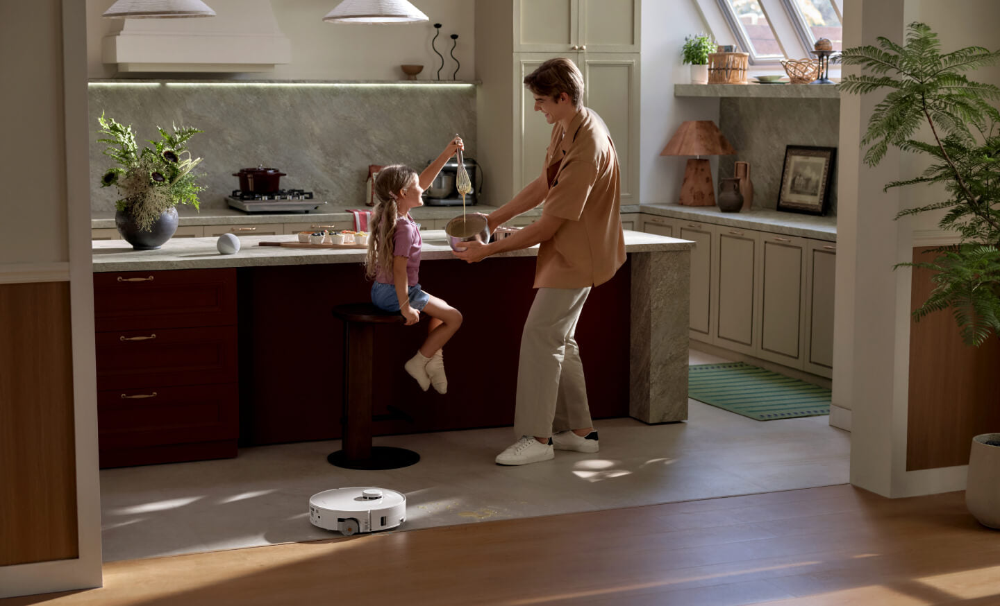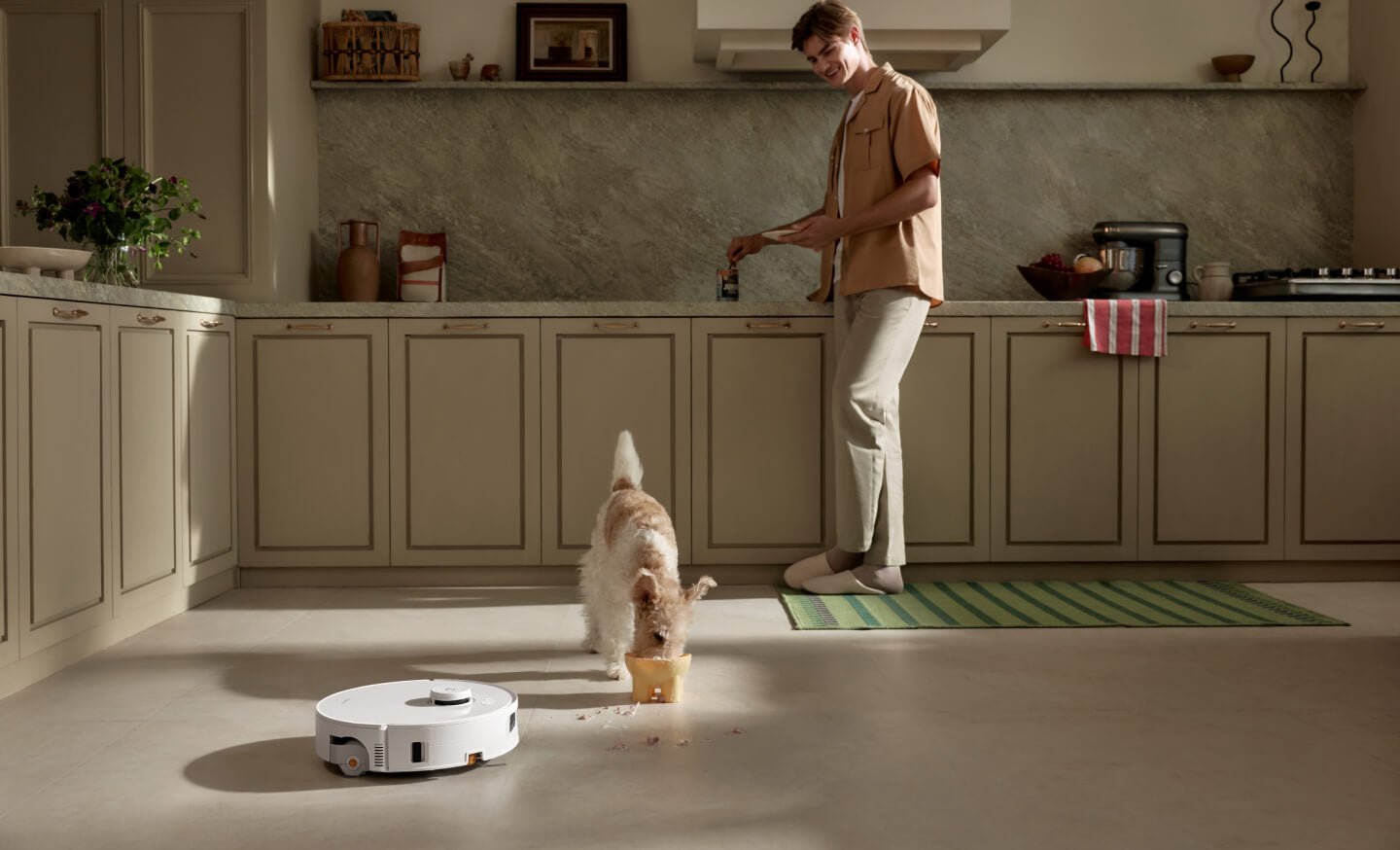 Ingin membersihkan karpet secara mendalam atau menghindari sepenuhnya? Cukup ketuk sekali saja. Robot akan beradaptasi secara otomatis: daya isap lebih kuat saat membersihkan karpet dengan pel terangkat, atau pembersihan tepi yang presisi untuk melewati permadani dan menjaganya tetap kering. Semua ruangan, permadani, selalu berada di bawah kendali Anda.