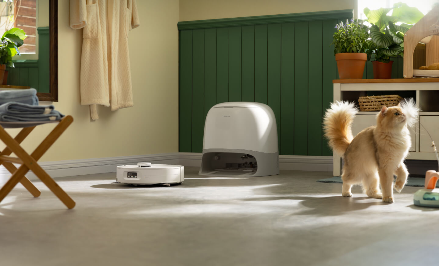 Robot dapat secara otomatis menemukan hewan peliharaan Anda, bahkan saat mereka bersembunyi. Anda juga dapat memantau lokasi dan status hewan peliharaan Anda saat Anda tidak sedang di rumah.